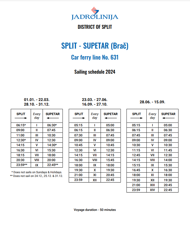 In der Hochsaison empfehlen wir Ihnen, von hier aus zu segeln Split-Supetar. Die großen Fähren (mit einer Kapazität von mehr als 120 Personenkraftwagen) verkehren stündlich. Wenn es zu voll ist, verkehren weitere Fähren ohne Zwischenstopp, bis sich der Andrang gelegt hat.